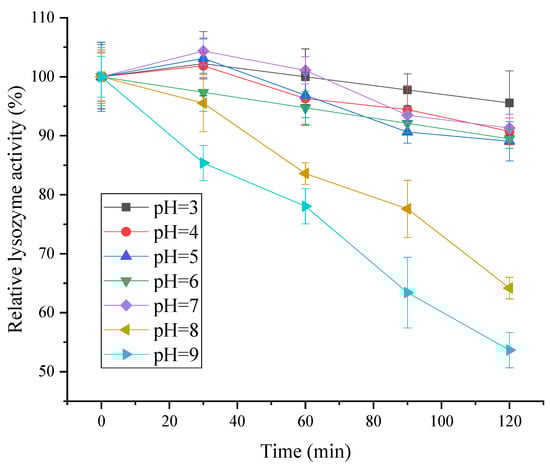 As shown in Figure 8, the relative activity of lysozyme remained above 85% in the range of pH 4 to 7, showing good stability. When pH > 7, lysozyme activity gradually decreased with the increase in treatment time. In conclusion, lysozyme from SDEW was stable under acidic and neutral conditions. However, the activity of lysozyme decreased significantly under the condition of high pH. The possible reason was that the main chain conformation of lysozyme in an acidic and neutral environment was only minimally affected by the change in acidity, and its structure was relatively stable. However, extreme changes in pH could cause the dissociation of internal molecular groups, resulting in the denaturation of lysozyme [30].