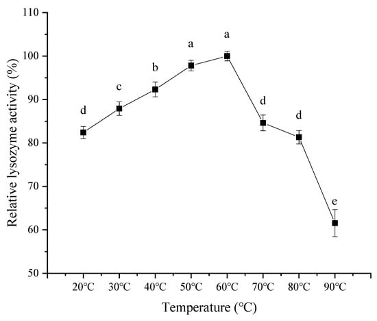 As observed in Figure 9, with an increase in reaction temperature, the activity of lysozyme from SDEW showed an increasing trend at first, followed by a decrease. The relative activity of lysozyme increased slowly with the increase in temperature from 20 °C to 60 °C. It may be because the high temperature causes the intermolecular movement to accelerate, promoting increased enzyme activity. However, when the temperature exceeded 60 °C, the lysozyme was gradually inactivated. Therefore, the optimal reaction temperature of lysozyme was 60 °C.