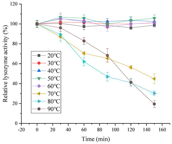 As shown in Figure 10, the lysozyme activity of SDEW was relatively stable at a lower temperature (20 °C to 60 °C). The activity of lysozyme decreased with the prolongation of treatment time. The decrease in lysozyme activity was accelerated with the increase in temperature. The reason for this phenomenon might be that with the increase in temperature, the thermal denaturation rate of lysozyme was accelerated, leading to the rapid inactivation of lysozyme.