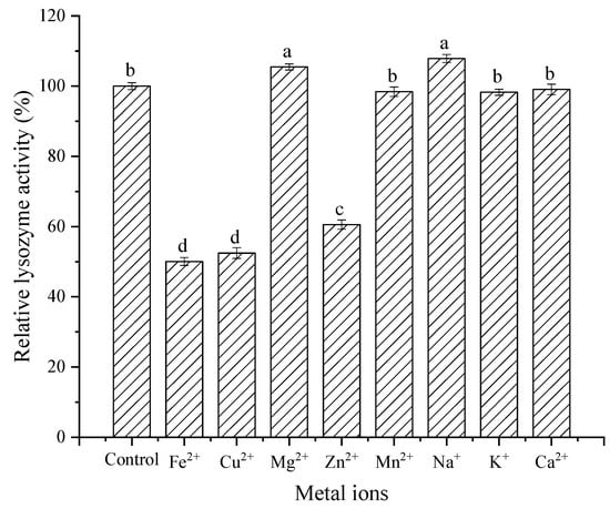 The solution of lysozyme from SDEW was prepared with phosphate buffer at a 20 μg/mL mass concentration. Next, different metal ions (Na+, K+, Ca2+, Fe2+, Cu2+, Mn2+, Zn2+, and Mg2+) were added to the enzyme solution, and the content of each metal ion in the solution was 0.01 mol/L. At the same time, a group of enzyme solutions without any metal ions was used as the blank control group, and the enzyme activity was set at 100%. After all the enzyme solutions were kept in a water bath at 25 °C for 30 min, the relative enzyme activity of each experimental group was determined.