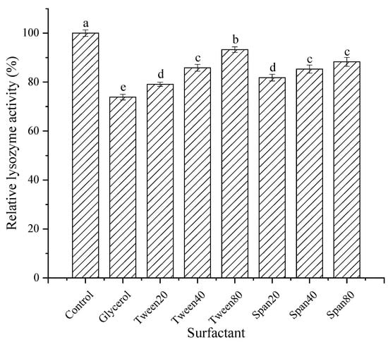 The SDEW lysozyme solution was prepared with phosphate buffer at a 20 μg/mL mass concentration. Next, glycerol, Span20, Span40, Span80, Tween20, Tween40, and Tween80 were added to the enzyme solution at a concentration of 1.0 mg/L for each surfactant. At the same time, a group of enzyme solutions without surfactants was used as the blank control group, and the enzyme activity was set at 100%. After all the enzyme solutions were maintained in a water bath at 25 °C for 30 min, the relative enzyme activity of each experimental group was determined.