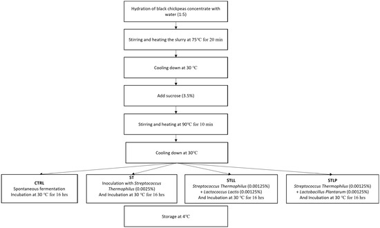 The protein concentrates from Apulian black chickpeas, with a protein content of 560 g kg−1 (d.m.), were obtained by dry-fractionation, provided by Innovaprot SRL (Gravina in Puglia, Italy), and produced from raw micronized flour of dehulled black chickpeas. Streptococcus thermophilus (LyofastV STV 10), Lactobacillus plantarum (Lactobacillus plantarum LPLDL®) and Lactococcus lactis ssp. Lactis (Lyofast VMO 01) were purchased from the company SACCO S.r.l (Cadorago, Italy). The three starters were certified to be vegan and isolated from plants. Sucrose was purchased from the market in Bari, Italy.