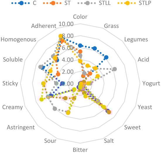 The QDA of the sensory features involved the presentation of the four samples (CTRL, ST, STLL, STLP). An amount of 50 mL of each sample at 4 °C was randomly coded to a panel of thirteen members (7 males; 6 females, age range 25 to 52) who were recruited among students and staff of the Food Science and Technology unit of the University of Bari, Italy, based on their previous experience in the sensory evaluation as described by [32]. The study protocol followed the ethical guidelines of the laboratory. The pre-test sessions were carried out by professors who are also members of the Italian National Organization of Experts panel for cheese sensory (ONAF) to define the list of descriptors (Appendix A Table A1). The panelists evaluated the appearance, orthonasal and retronasal sensations, mouthfeel, taste and texture on a 10-point hedonic scale where 0 represented the absence of the attribute, 1 represented the low intensity, and 9 represented the high intensity.