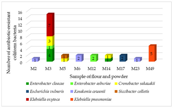 Antibiotic-resistant coliform bacteria isolated from flour, powder. M2—Teff, M3—Chestnut, M5—Amaranth, M6—Rice wholegrain, M12—Banana, M14—Chestnut, M17—Sorghum, M23—Rye, M49—Cricket.
