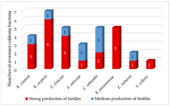Biofilms can be found in food, medical and natural environments. Pathogenic bacteria that enter food production areas can remain there in the form of a biofilm covering the surfaces of machinery and equipment. Biofilms formed on these surfaces are a major cause of contamination of the final product, which ultimately leads to disease transmission, reduced food shelf life and quality, and thus huge economic losses [63]. Studies suggest that the biofilm is important for the transfer of conjugation plasmids due to the high proximity of cells in this structure. The resistance of a biofilm to ATB depends on various factors, such as physical, physiological, and genetic factors [63]. In a mature biofilm, bacterial cells can tolerate antibiotics at concentrations 10–1000-fold higher than those required to kill planktonic cells [64]. The majority of isolated coliforms (72%) were strong producers of biofilm (Figure 3), which correlates with the results of Krahulcová, who evaluated 73% of coliform isolates from raw milk and smoothie as strong biofilm producers [25]. The remaining 28% of isolates were medium-strength biofilm producers. We identified 86% of K. oxytoca as a strong biofilm producer. All K. pneumoniae isolates were classified as strong biofilm producers. Biofilm-forming K. pneumoniae is a major source of nosocomial infections associated with high morbidity and mortality due to limited treatment options [63]. Two isolates of C. sakazakii showed strong production, while the remaining three isolates were intermediate biofilm producers. The survival and persistence of C. sakazakii in powdered infant formula require the body’s ability to adapt to harsh osmotic and dry conditions. Studies have shown that C. sakazakii cells in biofilms were more persistent compared to plankton cells when exposed to low humidity conditions [65].