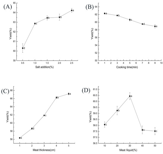 Effect of each factor on the yield of ST beef: (A) salt addition (based on ST mass); (B) cooking time; (C) meat thickness; (D) beef–ST ratio. Different letters above each bar mean significant differences.