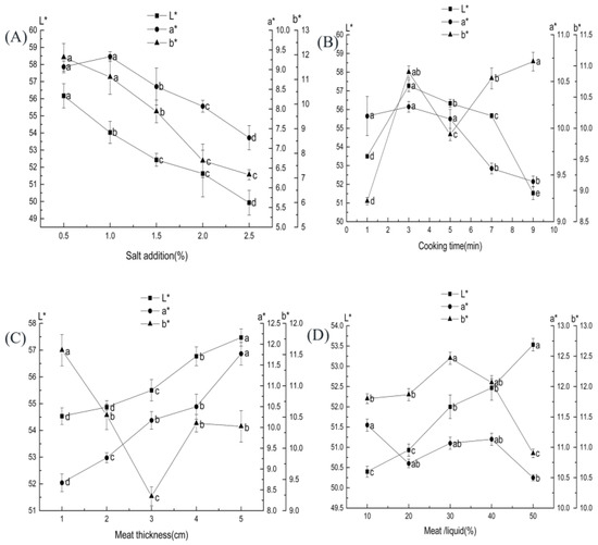 Effect of each factor on the color of ST beef: (A) salt addition (based on ST mass); (B) cooking time; (C) meat thickness; (D) beef–ST ratio. Different letters above each bar mean significant differences.