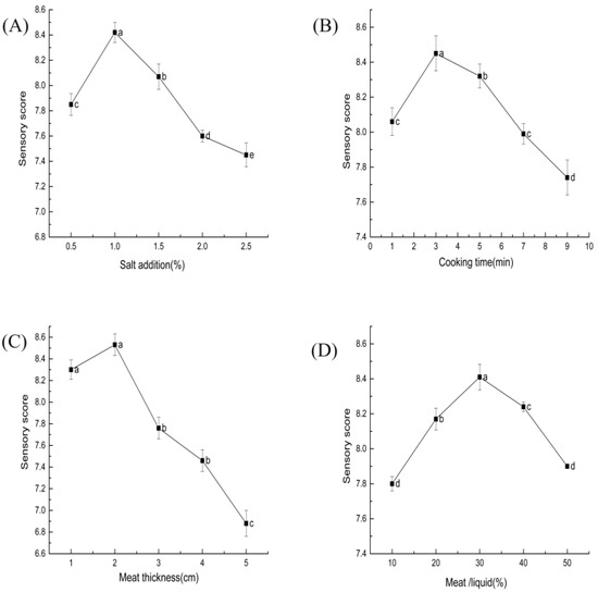 Effect of each factor on the sensory of ST beef: (A) salt addition (based on ST mass); (B) cooking time; (C) meat thickness; (D) beef–ST ratio. Different letters above each bar mean significant differences.