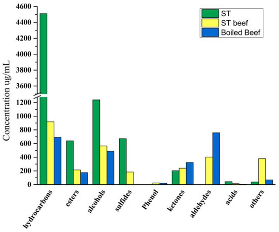 Figure 5 illustrated the changes in volatile compounds in ST, ST Beef, and boiled beef. The hydrocarbon concentration in beef increased from 689.940 μg/100 g to 917.386 μg/100 g after ST cooking, combined with Table S1, hydrocarbons such as copaene, β-sesquiphellandrene, β-bisabolene, β-elemene, zingiberene increased significantly. Wang, et al. [1] found that HST has high levels of terpenes, including β-sesquiphellandrene, β-myrcene, β-elemene, β-bisabolene, α-pinene, α-farnesene, D-limonene, copaene, and α-curcumene, were mainly derived from raw materials and excipients, such as tomatoes, red peppers. At the same time, the concentration of esters in beef increased from 689.940 µg/100 g to 917.386 μg/100 g after cooking in ST.