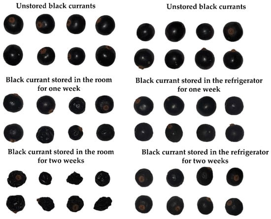 Black currants in their fresh form are available for a few weeks in the year. They are very perishable and have a very short shelf life. Therefore, lowering the storage temperature or even freezing them can extend their shelf life [,]. Black currant is a non-climacteric fruit. The respiration rate decreases after harvest and is significantly higher for freshly harvested fruit than for the air-stored samples. Black currants designated for consumption can be stored under room conditions for about 2–3 weeks []. Storage can cause some quality changes in black currant []. Generally, berries as non-climacteric fruit are harvested fully ripened and are characterized by relatively rapid water loss and susceptibility toward damage and decay. Changes in berry quality during storage can also include the content of polyphenols, vitamins, minerals, titratable acidity, soluble solids, and pH. Refrigeration and freezing used for short- and long-term storage protect against the loss of heat-sensitive nutrients. Lowering the storage temperature reduces respiration rate, mold growth, pigment degradation, chemical changes, enzymatic reactions, and changes in cell structure []. Besides chemical composition and internal structure, external characteristics of black currant berries are important quality parameters. For example, fruit color and gloss are essential quality indicators []. In addition to the quality and chemical composition of berries, sensory attributes related to taste, appearance, and structure can also change during storage [,].