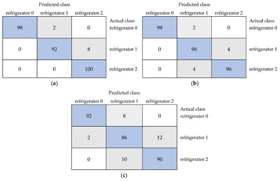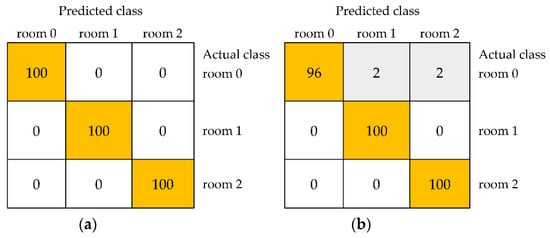 For the Lab color space, the obtained results were also very high. However, an average accuracy of 100% and the kappa statistic and weighted averages of precision, recall, MCC, ROC area, and PRC area equal to 1.000 for distinguishing unstored black currants and samples stored in the room for one and two weeks were found only for a model built using the IBk algorithm (Table 3). In the case of results for storage at room temperature, other algorithms allowed the classification of samples with an average accuracy of 96.67% for JRip to 99.33% for multilayer perceptron. Confusion matrices shown in Figure 4 confirmed the completely correct distinguishing of three samples for IBk (Figure 4a) and revealed the lowest accuracies equal to 92% for the unstored sample, 98% for the sample stored in the room for one week, and 100% for fruit stored in the room for two weeks in the case of JRip (Figure 4b).
