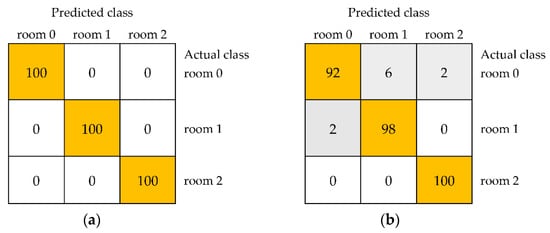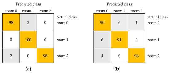 The confusion matrices of the classification of three classes of black currants, namely unstored (room 0) and stored at room temperature for 1 week (room 1) and 2 weeks (room 2), based on selected image textures from color space RGB using models developed using the IBk (a) and JRip algorithms (b).