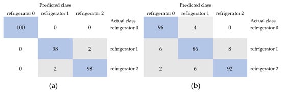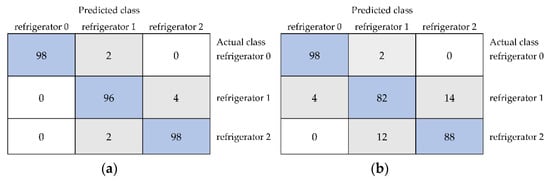 The confusion matrices of distinguishing unstored black currants (refrigerator 0) and samples stored in the refrigerator for 1 week (refrigerator 1) and 2 weeks (refrigerator 2) for models including selected image textures from color space Lab developed using the multilayer perceptron (a) and JRip (b).