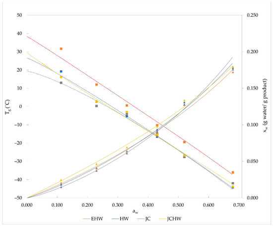 Moreover, to obtain the critical water content and activity values related to glass transition, the combined Tg-xw-aw data and the Henderson and Gordon and Taylor fitted models were used. Results are shown in Figure 1. In the cases of HW, EHW and JCHW, powders could be stored at 20 °C, but in the case of JC at this temperature, the powder is already in its amorphous state.