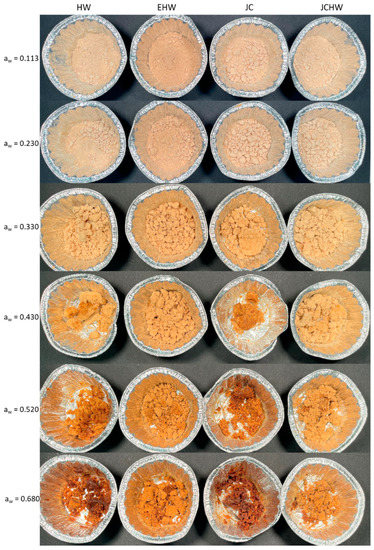 Powder photographs after three months of storage at different water activities. HW: hot water; EHW: extrusion + hot water; JC: jet cooker; JCHW: jet cooker + hot water.