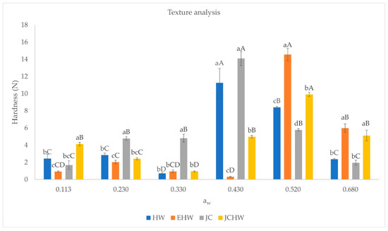 Hardness at different water activities. HW: hot water; EHW: extrusion + hot water; JC: jet cooker; JCHW: jet cooker + hot water. Different small letters for the same aw indicate significant difference according to Tukey test (p < 0.05) between treatments. Different capital letters in the same treatment indicate significant difference according to Tukey test (p < 0.05) between water activities.