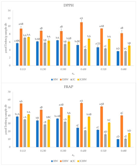 Antioxidant capacity of the samples (DPPH and FRAP) at different water activities. HW: hot water; EHW: extrusion + hot water; JC: jet cooker; JCHW: jet cooker + hot water. Different small letters for the same aw indicate significant difference according to Tukey test (p < 0.05) between treatments. Different capital letters in the same treatment indicate significant difference according to Tukey test (p < 0.05) between water activities.