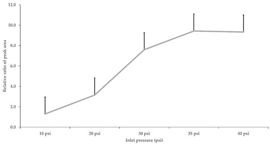 MS columns have been used in several optimized GC–MS/MS methods [6,10,11]. The columns used in those studies had the same MS column size as in this experiment. For the most suitable selectivity and sensitivity, a SemiVolatiles (0.25 mm i.d., ×30 m, 0.25 µm film thickness, Phenomenex, Torrance, CA, USA) column was used. The pulsed pressure injection mode can increase the peak area, leading to a much lower limit of quantitation (LOQ) [24]. The injection volume was 2 μL, and the pulsed pressure injection mode was used for better sensitivity. Non-pulsed and pulsed detection with pressures of 10, 20, 35, and 40 psi were compared for the best peak area enhancement. The best peak areas resulted from 35 and 40 psi (Figure 1). However, there was no significant difference between the 35 and 40 psi injections; hence, 35 psi was chosen as the optimum pressure for pulsed injection. Figure 2 shows the chromatographic peaks of seventeen PIs; these were obtained with good resolution and peak shape.