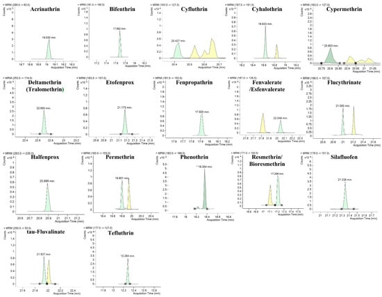 Acrinathrin (≥98.0%), bifenthrin (≥98.0%), cycloprothrin (≥98.0%), cyfluthrin (≥95.0%), cyhalothrin (≥98.0%), cypermethrin (≥90.0%), deltamethrin (tralomethrin) (≥98.0%), etofenprox (≥98.0%), fenpropathrin (≥98.0%), fenvalerate/esfenvalerate (≥98.0%), tau-fluvalinate (≥95.0%), flucythrinate (≥95.0%), halfenprox (≥98.0%), permethrin (≥90.0%), phenothrin (≥90.0%), and tefluthrin (≥95.0%) were purchased from Sigma-Aldricsentence (St. Louis, MO, USA). Resmethrin/bioresmethrin (1000 mg/L in acetonitrile) and silafluofen (1000 mg/L in acetonitrile) were obtained from the Ministry of Food and Drug Safety (Cheongju, Korea). Acetonitrile, acetone, ethyl acetate, and distilled water (HPLC grade) were purchased from Fisher Scientific (Seoul, Korea). QuEChERS extraction salt original, EN, AOAC packages, and d-SPE (MgSO4), primary secondary amine (PSA), graphitized carbon black (GCB and C18) were obtained from Restock (Bellefonte, PA, USA).