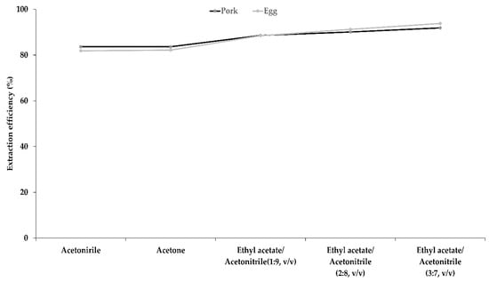 Extraction efficiencies of pyrethroid insecticides in pork and egg using various extraction solvents.