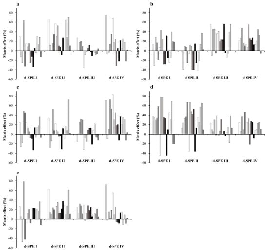 Matrix effects of pyrethroid insecticides in beef (a), pork (b), chicken (c), milk (d), and eggs (e) using dispersive solid phase extraction (d-SPE) mixtures I–IV. d-SPE I–MgSO4 150 mg, primary secondary amine (PSA) 25 mg; d-SPE II–MgSO4 150 mg, PSA 25 mg, C18 25 mg; d-SPE III–MgSO4 150 mg, PSA 25 mg, graphitized carbon black (GCB) 25 mg; d-SPE IV–MgSO4 150 mg, and C18 25 mg.