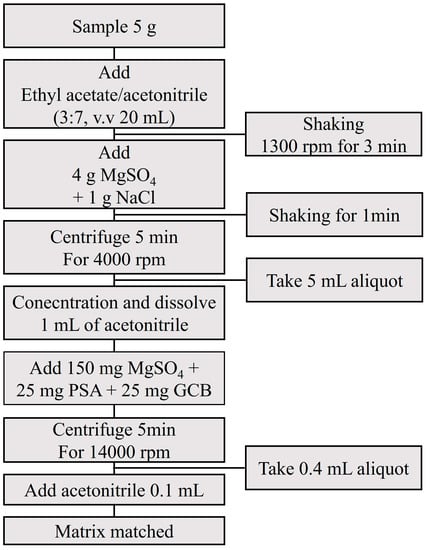 - Anastassiades, M.; Lehotay, S.J.; Stajnbaher, D.; Schenck, F.J. Fast and easy multiresidue method employing acetonitrile extraction/partitioning and “dispersive solid-phase extraction” for the determination of pesticide residues in produce. J. AOAC Int. 2003, 86, 412–431. [Google Scholar] [CrossRef]