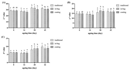 Effects of different treatments on L* (A), a* (B), and b* (C) values of dry-aged beef. a–c Means having same lowercase letters indicate no significant differences between ageing times for the same group, p > 0.05.