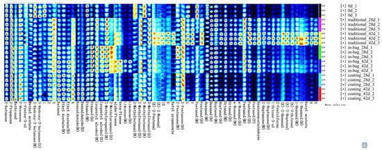 Compared to the traditional group, some compounds accumulated less in the coating group, including 1-octene-3-ol, 2-pentylfuran, 2-heptanone, benzene acetaldehyde, pentanol, nonanal, octanal, heptanal, pentanal, methional, butyl propanoate, and butyl acetate. Benzaldehyde, ethyl acetate, and butanal in the coating group were higher than the traditional group. Most components of cinnamon bark oil were not detected in the coating group. The reason may lie in three aspects: (ⅰ) the coating solution existed in the outer part of beef and did not permeate into the inner part during ageing; (ⅱ) the dehydrated outer part was trimmed; (ⅲ) components of cinnamon bark oil degraded at the high temperature of pan-frying. For example, cinnamaldehyde, the main component of cinnamon bark oil, could degrade to benzaldehyde above 60 °C [].