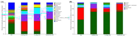 The V3–V4 region of bacterial 16S rDNA was sequenced. A total of 107,166 sequences (average length 424 bp) were obtained from fresh beef, 170,324 sequences (average length 425 bp) from the coating group, 162,779 sequences (average length 424 bp) from the in-bag group, and 168556 sequences (average length 425 bp) from the traditional group. As shown in Figure 3A, the initial bacterial community was dominant by Pseudomonas (37.05%), Acinetobacter (8.40%), Leuconostoc (7.45%), Staphylococcus (6.13%), and Enterobacter (5.83%). After 42 days of dry-ageing, the dominant genera in the traditional group were Pseudomonas (46.68%), Delftia (23.31%), and Rhodococcus (14.20%). The dominant genera in the in-bag group were Leuconostoc (30.46%), Delftia (22.15%), Rhodococcus (20.03%), Pseudomonas (11.05%), and Lactobacillus (7.05%). Similarly, the dominant genera in the coating group contained Leuconostoc (31.05%), Delftia (21.70%), Rhodococcus (10.81%), and Pseudomonas (9.59%). The proportions of Pseudomonas were lower (p < 0.05) in the in-bag group and coating group than the traditional group. This indicated that in-bag dry-ageing and coating dry-ageing inhibited the growth of Pseudomonas. Pseudomonas is commonly detected in dry-aged beef [,,]. Pseudomonas could partly out-compete lactic acid bacteria []. The lower proportion of Pseudomonas may lead to the higher proportion of Leuconostoc in the in-bag group and coating group.