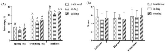 Dry-ageing resulted in losses due to water evaporation (ageing loss) and trimming of the dried surface (trimming loss). The ageing loss, trimming loss, and total loss of beef after 42 days of dry-ageing are shown in Figure 4A. Ageing loss was higher in the traditional group (16.15 ± 1.00%) and coating group (14.71 ± 1.52%) than the in-bag group (11.92 ± 1.18%). Trimming loss (22.33–25.74%) showed no significant differences among three groups. Total losses of the traditional group (35.17 ± 2.47%) and coating group (33.61 ± 1.05%) were higher than the in-bag group (30.19 ± 1.45%). Compared to traditional dry-ageing, in-bag ageing decreased ageing loss by 3.23% and total loss by 4.98%. Shi et al. [] found that in-bag dry-ageing controlled the level of weight loss and total loss during dry-ageing, depending on the moisture permeability of bags. The inhibition effects of the coating on yield were not significant compared to traditional dry-ageing. A contrary result was reported by Gudjónsdóttir et al. [], who found that electrospun chitosan fiber wrapping reduced ageing loss, trimming loss, and total loss compared to traditional dry-ageing. The reason for different results may be that the chitosan wrapping material prepared by electrospinning has a smaller pore size, and, thus, is more resistant to water evaporation than the chitosan film produced by the coating.