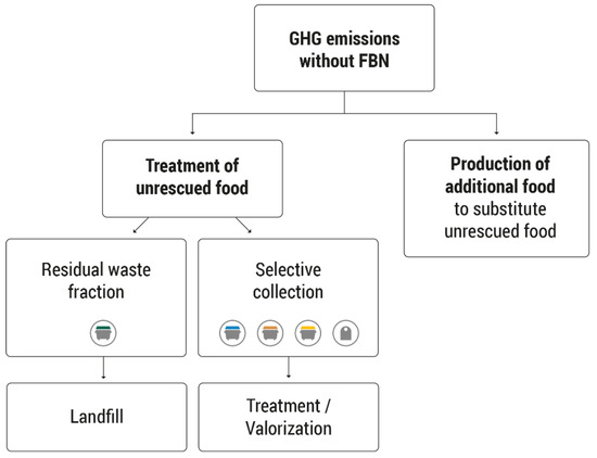 The hypothetical scenario without the FBN followed the system boundaries used in similar studies [29,30]. In this theoretical scenario, most of the food that was recovered by this institution would be wasted. Therefore, the absence of the FBN would entail the emission of GHGs as a result of two elements (Figure 2):