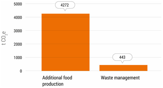 In the theoretical case where the FBN did not exist, the GHG emissions would have reached a total of 4715 tonnes of CO2e in 2018, of which 91% would have been emissions associated with additional food production, while 9% would have been emissions associated with waste management (Figure 4).