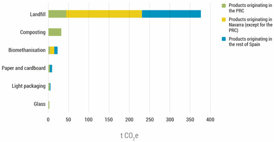 The emission factors associated with the valorisation or disposal processes were selected according to the most recent literature. The factors for biomethanisation and the composting of organic matter were taken from the National Greenhouse Gas Inventory of the Spanish Ministry for the Ecological Transition and the Demographic Challenge [42]. On the other hand, the emission factors for the final treatment of paper, cardboard, light packaging, and glass were taken from the report on the “Calculation of GHG emissions from municipal waste management” from the Catalan Office for Climate Change [43]. In the case of emissions from the Góngora Waste Treatment Centre, which managed the PRC waste, the factors from the PRC annual carbon footprint report were used (personal communication from Álvaro Miranda, from the PRC, 16 April 2020).