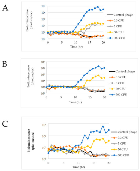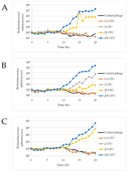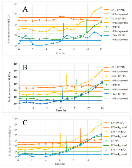 Detection of (A) 2 CFU, (B) 20 CFU, and (C) 200 CFU per sample using various amounts of the ΦV10nluc phage. The arrows indicate the times when the luminescence of the sample increases above that of the cell-free controls.