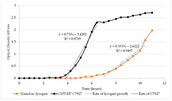 Growth of E. coli O157:H7 C7927 and C7927 ΦV10nluc lysogen at 37 °C.