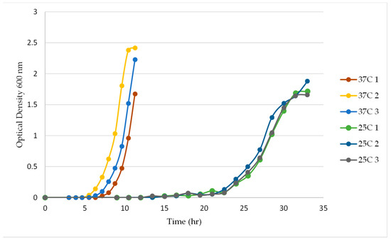 Growth of E. coli O157:H7 C7927 ΦV10nluc lysogen at 37 °C and 25 °C.