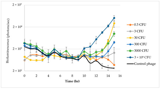 An additional experiment was conducted using a 1:1 ratio of mTSB media to raw ground beef in the Nalgene bottles over 20 h in order to evaluate if a decrease in media would lead to higher available oxygen for the bacteria, potentially resulting in a shorter time to detection. Observations during this experiment included that there was still gas release upon opening the bottles after 8 h; however, there was less pressure and less gas released compared with the 2:1 ratio experiment. Results indicate that the ΦV10nluc phage detected approximately two cells in one out of three assays (Figure 7B). Figure 7 shows that a higher cell concentration correlated to higher measured luminescence over time. Similar to the 2:1 ratio Nalgene bottle experiment, 200 CFU was detected at roughly 11 h in all 3 replications while 20 CFU was detected at roughly 15 h. No luminescence above the control response was detected in any Nalgene bottle studies containing 0.2 to 0.3 CFU (Figure 6 and Figure 7).