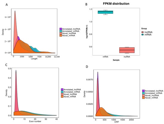 Based on the transcriptome, Our study obtained 39123 protein-coding transcripts (38982 known protein-coding transcripts and 141 novel protein-coding transcripts) and 13979 lncRNA transcripts (6646 known lncRNA transcripts and 7333 novel lncRNA transcripts). The average transcript lengths and their expressions of lncRNAs were less than those of protein-coding transcripts (Figure 1A,B). Meanwhile, the average exon numbers of protein-coding transcripts were much larger than those of lncRNAs (Figure 1C). Furthermore, our results showed that known and novel lncRNAs had shorter open reading frame (ORF) lengths compared with those of mRNA transcripts (Figure 1D). The sub-figures of Figure 1A,C,D are shown in Figure S1.