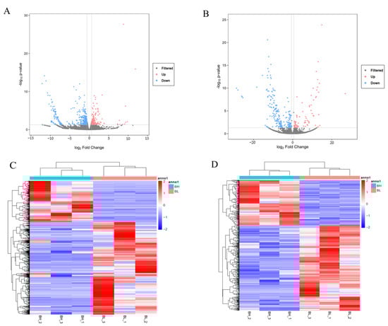 To identify mRNAs and lncRNAs related to differences in backfat quality between BH and BL Beijing Black pigs, DEGs and DELs were performed after the basic analysis of sequencing results. A total of 610 DEGs (Table S4), including 212 upregulated genes and 398 downregulated genes, and 290 DELs (Table S5), including 77 upregulated lncRNAs and 213 downregulated lncRNAs, were finally identified. The volcano plots (Figure 2A,B) and heatmaps (Figure 2C,D) show the clusters of the DEGs and DELs based on the expression. The results show similar expression patterns and relationships in each group.