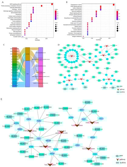 An expression–regulation network was constructed by mRNAs and lncRNAs related to lipid deposition and metabolism. According to the results of the correlation coefficient analysis as well as KEGG analyses, the DEGs related to fat metabolism were selected (|PCC| > 0.9) for co-expression construction to identify the key lncRNAs regulating fat deposition.