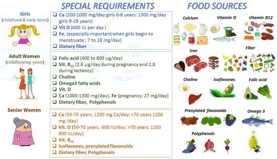 Qualitatively, nutritional needs throughout all periods of life are similar, but there are large quantitative differences. For example, during infancy, pregnancy and lactation, the macro- and micro-nutrient requirements are greater than in other phases. For instance, pregnant and lactating women require more energy, protein, iron, calcium and vitamins. Rapid growth during infancy, childhood and adolescence also increases the requirements for essential nutrients. In elderly females, it is important to decrease energy consumption as the basal metabolic rate declines. However, minerals and vitamins, particularly calcium, thiamine and pyridoxine, remain no less essential for the elderly and adults []. Special nutritional requirements for women depending on age and physiological state, as well as their main food sources, are summarized in Figure 1.