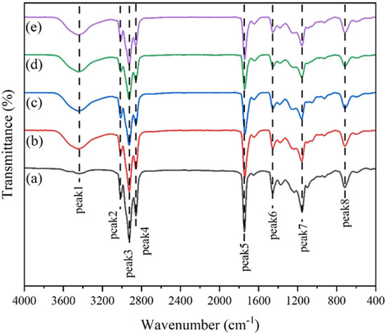The tuna oil (Figure 1a) had no obvious absorption peaks at Peak 1, while all four hydrolyzed acylglycerols (Figure 1b–e) showed broad and strong absorption peaks on Peak 1, indicating the presence of hydroxyl groups (-OH) in their group structures. This may be because tuna oil existed mainly as TAGs before hydrolysis, while DAG and MAG were generated after hydrolysis. The signal intensity of the tuna oil (Figure 1a) on Peak 2–7 was significantly greater than that of the four hydrolyzed acylglycerols (Figure 1b–e). This may be because the lipase cleaved the fatty acid esterified on the glycerol backbone during the hydrolysis of the fish oil, destroying the ether bond (-C-O-C-) so that one or two of the triacylglycerols containing a carbon–carbon double bond (C=C), methylene (-CH2-), and carbonyl (C=O) functional groups in the fatty acids were replaced by the hydroxyl groups. As a result, the content of the functional groups on Peak 2–7 in the four hydrolyzed acylglycerols (Figure 1b–e) decreased, and the signal intensity dropped.