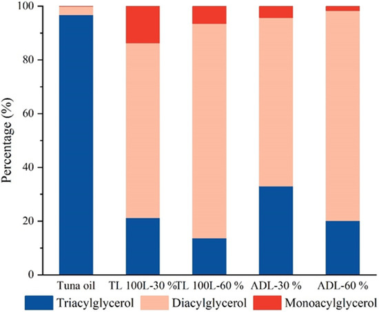 Figure 2 shows the acylglycerol composition in tuna oil and its hydrolysates hydrolyzed by TL100 and ADL, respectively (TL 100 L-30%, TL 100 L-60%, ADL-30%, and ADL-60%). It can be seen from the figure that the type of lipase and the degree of hydrolysis significantly affected the percentage of each acylglycerol in the fish oil. Before the hydrolysis of the tuna oil, the proportion of TAG in the acylglycerols reached more than 90%. After hydrolysis by the lipase, the content of TAG in the tuna oil decreased substantially, while DAG dominated. This may be because fish oil is generally hydrolyzed at the sn-1,3 position, and the catalytic triplet will preferentially hydrolyze the acyl group at the sn-1,3 position so that the diacylglycerol content increases. Morales-Medina et al. speculated that the reason the content of MAG in the fish oil hydrolysates was much less than the content of DAG was that the fatty acids on TAG were more easily cleaved by enzymatic hydrolysis than those on DAG [33]. Compared with the three other hydrolysates, TL 100 L-60%, ADL-30%, and ADL-60%, TL 100 L-30% had the highest proportion of MAG. This may be because lipase TL 100 L was a specific lipase with selectivity for sn-1,3 positions [34], which selectively hydrolyzed the fatty acids attached at sn-1 and sn-3 positions in the TAG, resulting in the formation of MAG and the enrichment of fatty acids at the sn-2 position. However, the higher the degree of hydrolysis of the tuna oil, the lower the proportion of MAG. This may be because the formation and continuous hydrolysis of MAG was carried out at the same time, but the hydrolysis rate is faster than the formation rate [35]. (Appendix A).