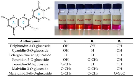 The sugar moiety is glucose (glucoside) and/or acetyl- or cinnamoyl derivatives of glucose (acetylated- or coumarylated glucosides) [2,3]. The glucose is linked to the skeleton by a glycosyl bond at position 3 of the C ring (so-called monoglucosides). For diglucosides, glycosidic bonds are found both in position 3 of the C ring and position 5 of the A ring. The part of the molecule without sugar moiety is called anthocyanidin aglycone. The glycosylation of anthocyanidins in plants is very important, affecting the physicochemical properties of the molecule (e.g., stability and hydrophilicity or water solubility). The structure of anthocyanins is pH-dependent, which basically determines the color of the chromophore. In an acidic medium, the flavilium cation is red (Figure 1), whereas in a basic medium, the quinoidal form is blue. In addition, colorless carbinol (pseudobase) and yellow chalcone forms are also known [4,5]. The acidic pH in the berries is provided by the organic acids such as tartaric acid, malic acid, and citric acid.