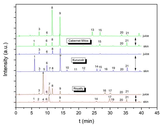 HPLC-DAD chromatograms of skin extract and juice for ‘Royalty’, ‘Kurucvér’, and ‘Cabernet Mitos’ grape varieties. Identified compounds designated by numbers are summarized in Table 2.