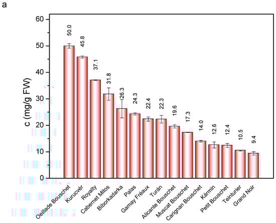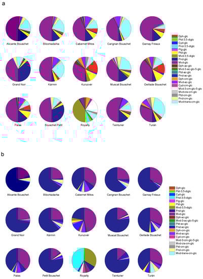 For all the cultivars with the exception of ‘Royalty’, Mvd-glc was the most abundant anthocyanin with a level of 3894–19,102 µg/g FW in the skin (Table 3). For five cultivars, namely, ‘Alicante Bouschet’, ‘Bíborkadarka’, ‘Gamay Teinturier Fréaux’, ‘Kármin’, and ‘Teinturier’, the amount of malvidin-3-O-glucoside was >50% of the total anthocyanin content (Figure 3a). Berries’ skin of ‘Royalty’ contained the lowest level of Mvd-glc (2207 µg/g FW; 6.0%). In this cultivar, Mvd-3,5-diglc (15,264 µg/g FW; 41.2%) and Mvd-3-ac-glc-5-glc (910 µg/g FW; 19.1%) were the major anthocyanins. For all the cultivars, a common malvidin derivative was the Mvd-trans-cm-glc. Its level varied in the range of 900–7240 µg/g FW. In some teinturier varieties, Pnd-glc was found to be significant. The berries’ skin of ‘Grand Noir’ and ‘Petit Bouschet’ contained Pnd-glc at a high ratio and relatively high concentration (3468–3959 µg/g FW). Dph-glc at a higher level was found in only two cultivars, namely, ‘Oeillade Bouschet’ (7030 µg/g FW) and ‘Kurucvér’ (7930 µg/g FW). These two cultivars had similarly high Ptd-glc levels (5890 µg/g FW and 4990 µg/g FW, respectively). In contrast, Cyd-glc was detected in almost all grape varieties. In the skin, it was again found at the highest concentration in ‘Oeillade Bouschet’.