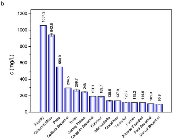 In the juice samples, for most of the varieties, Pnd-glc was the predominant anthocyanin (Figure 3b). Its concentration varied between 42.4 and 381.6 mg/L (Table 3). Mvd-glc was dominant in the juice sample of ‘Kurucvér’. An also typical characteristic of the berry juice of ‘Kurucvér’ is its relatively high Cyd-glc ratio (11.1%). Other cultivars produced a significantly lower proportion of Cyd-glc (1.0–6.4%). The concentration of Plg-glc reached 2–4 mg/L in the berry juice for several varieties such as ‘Kurucvér’, ‘Bíborkadarka’, and ‘Grand Noir’. This anthocyanin is typically not or hardly detected in Vitis vinifera grape berries [40]. Like the skin, the composition of ‘Royalty’ berries’ juice was utterly different, containing two dominant anthocyanins, Pnd-3,5-diglc and Mvd-3,5-diglc, at very high concentrations (434.0 and 349.7 mg/L, respectively). Dph-glc was only detectable as trace in all but four varieties: the highest Dph-glc content was found in ‘Turán’, followed by ‘Kurucvér’, ‘Royalty’, and ‘Oeillade Bouschet’. In the former studies, Dph-glc was also found in relatively low amounts in ‘Yan 73’ [29,36,37,39], ‘Kolor’ [29,36], ‘Salt Greek’ [29], and ‘Gamay de Bouze’ and ‘Gamay Fréaux’ [41], but in relatively high amounts in ‘Yan 74’ (10.5 mg/g) [29] and ‘Summer Black’ (109.76 mg/100 g) and ‘Summer Black mutant’ (282.8 mg/100 g) [42].