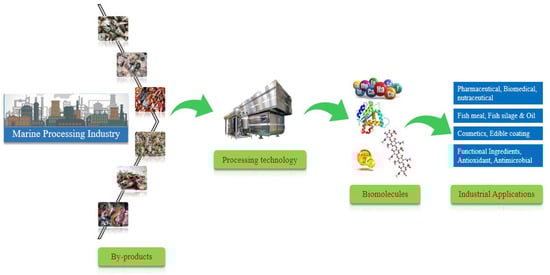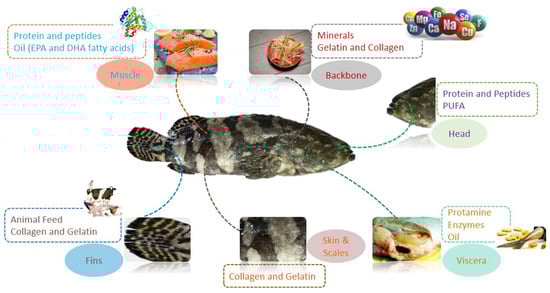 Extensive amounts of by-products are produced as a result of fish processing and are estimated to be up to 60% of the total fish weight []. Usually, fish processing by-products are dumped as waste in oceans and on land and contain highly valuable components that can cause serious environmental pollution. These by-products are also used as dietary components in fish meal, silage and fertilizer production. Fish processing by-products contain components such as the skin, scales, viscera, head, trimmings, roe and bones which are unfit for human consumption and are discarded as waste []. These by-products are a good source of nutritional components, especially lipids and proteins as well as functional components (Figure 1).