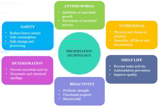 Fish are considered highly nutritious products of the aquaculture system due to the presence of well-balanced macronutrients such as proteins, lipids and micronutrients such as vitamins and minerals []. These fish are a good source of human food that promotes growth and protection of the body from a variety of health diseases such as cardiovascular and coronary heart diseases and prevents rickets and mental diseases in children []. The protein present in fish has high nutritional value because essential amino acids serve as antioxidant elements in various nutraceutical industries. These amino acids possess many properties such as gel formation, oil adsorption, water-holding capacity and health-related properties. Amino acids also have antihypertensive, blood quality maintenance, muscle tissue repairing and system-regulating properties in humans []. Lipids are important for health and are rich in polyunsaturated fatty acids (PUFAs), especially eicosapentaenoic acid (EPA) and docosahexaenoic acid (DHA) which help to prevent cardiovascular diseases and coronary heart diseases and maintain mental health in children []. Similarly, fish contains a perfect balance of all essential vitamins, especially vitamins A and D, and are also a significant source of vitamin B. Vitamin B mostly prevents calcium-deficient diseases and rickets in children. Minerals are micronutrients that vary from species to species, including calcium, iron, zinc, selenium, iodine, phosphorus and potassium. These micronutrients have high bioavailability and antioxidant properties that are useful for curing various diseases [].Fish and their products can be spoiled easily if not preserved properly. Fish and fish product quality deteriorates because of digestive enzymes, lipid oxidation and microbes which actively contribute to fish spoilage []. Compositional changes in protein and lipids lead to the development of new products that cause physiological and chemical changes. Therefore, it is necessary to understand and minimize the factors that contribute to fish spoilage by using active preservation techniques to sustain the freshness of fish and fish-containing products []. Various preservation techniques are used to preserve and process fish at an industrial level such as pulsed electric field pulsed electric field (PEF), fluorescence spectroscopy, hyperspectral imaging technique (HSI) and high-pressure processing (HPP) while traditional techniques include cooling, freezing and super-chilling []. Excellent food preservation techniques effectively prevent microbial spoilage and prolong the product shelf life with limited adverse changes in the quality and nutritional values, texture and flavour. Many studies have focused on chemical and low-temperature storage methods for fish preservation. Fish is a part of a healthy diet and provides essential components such as proteins, vitamins, polyunsaturated fatty acids and minerals that are necessary for healthy growth. Fish is a highly perishable food and its quality is adversely affected during storage by several factors such as enzymatic autolysis, microbial growth and oxidation [].