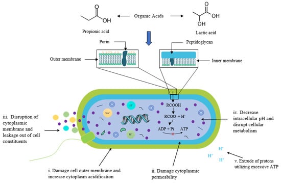 Several antimicrobial compounds including nitrites, sulfites and organic acids are used to control the microbial load [] (Table 2). Nitrites along with sodium chloride are generally used as salt reservoirs (sodium nitrite and potassium nitrite) in fish products as antimicrobial agents for toxin-producing compounds (Clostridium botulinum) and used to improve colour []. Nitrites adversely affect the activity of microorganisms through several reactions including (a) reacting with an alpha-amino group of amino acids at low pH, (b) blocking the sulfhydryl group, (c) reacting with iron-containing compounds that inhibit the bacteria from using iron and (d) interfering with membrane permeability which limits transport across cells [] (Figure 3).